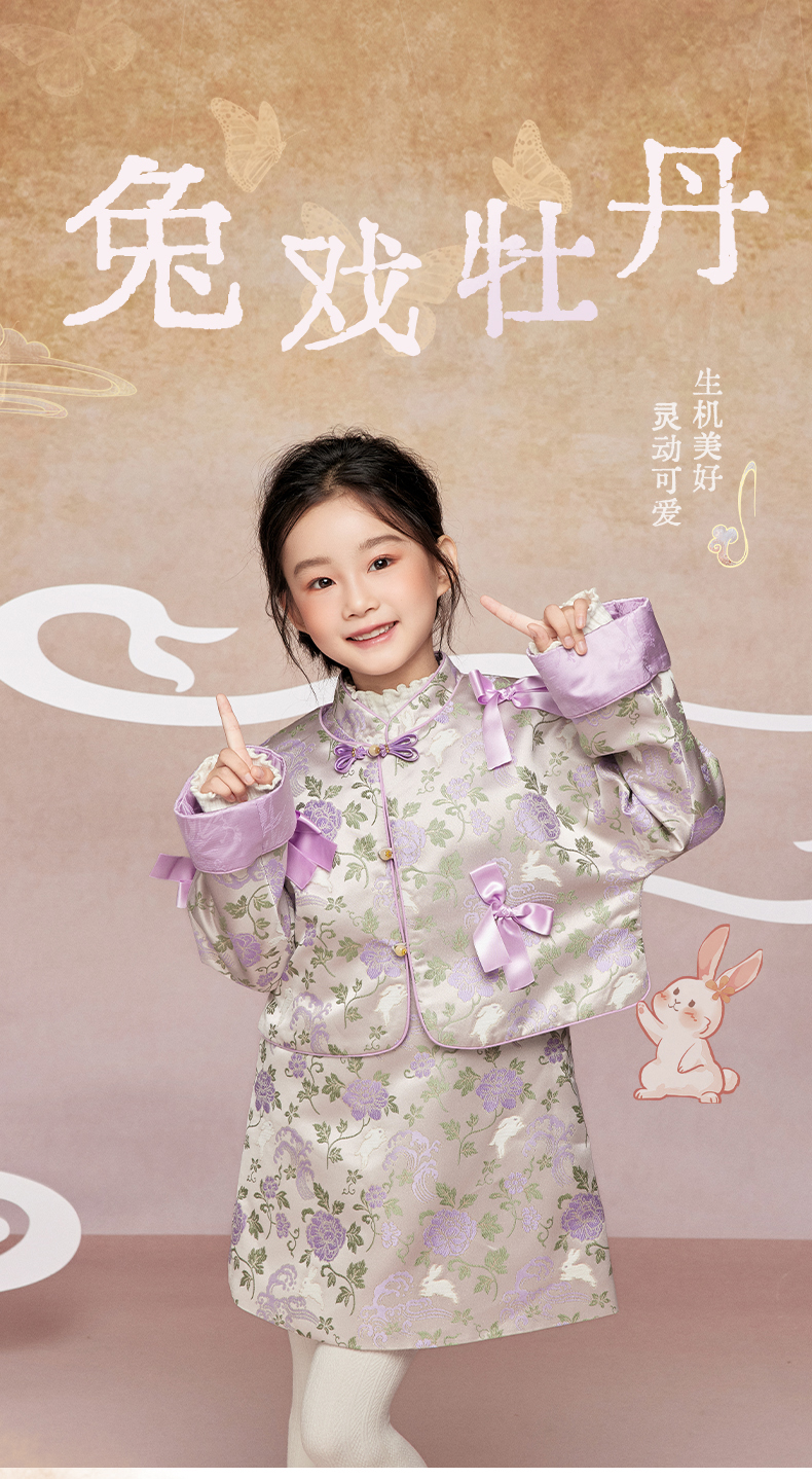 肩上云【兔戏牡丹】女童新中式外套连衣裙套装国风古典仙气演出服jianshangyun[Rabbit Playing with Peony] New Chinese Style Girls’ Outerwear and Dress Set, Traditional Chinese Style, Classical Fairy-like Performance Costume