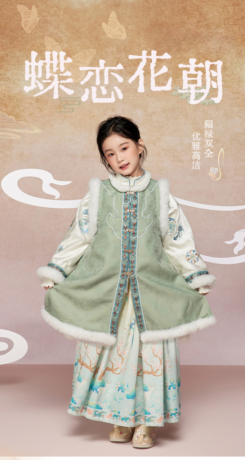 肩上云【蝶恋花朝】女童浅绿色对襟盘扣马甲裙套装中式演出服”Jian Shangyun [Butterfly Loves Flower Morning] girls’ light green double-breasted button-up vest and skirt set, traditional Chinese performance costume”